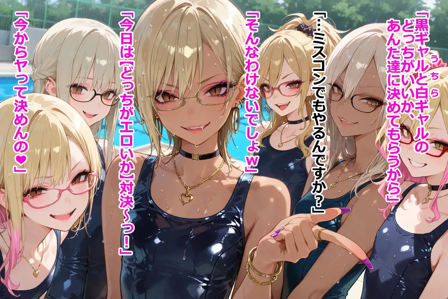 | タイトル | 全員ちっぱい眼鏡ギャルの水泳部!スク水の黒ギャル白ギャルどっちがえっち? |