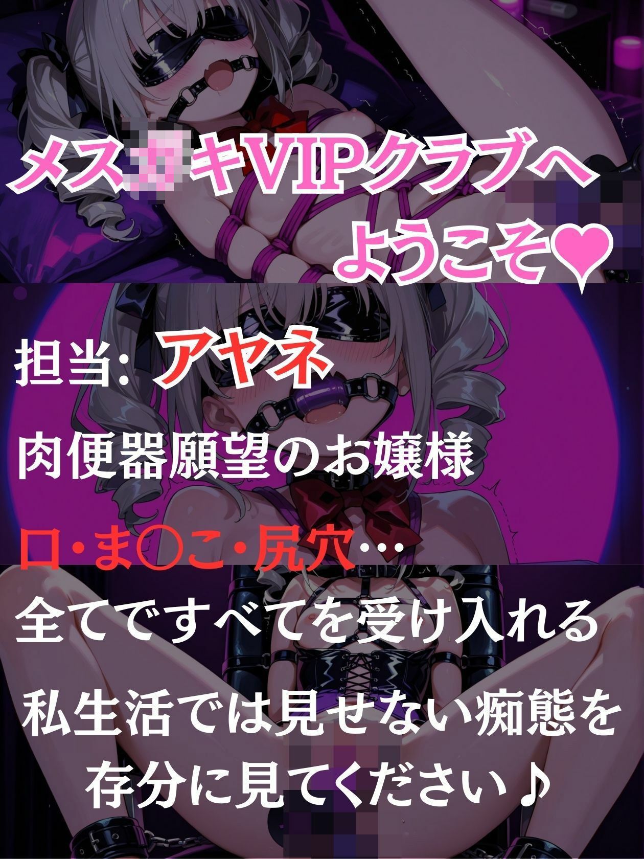| タイトル | メスガキVIPクラブへようこそ 〜担当 アヤネ 「…わたしの穴、全部めちゃくちゃにしてください、、」 〜 |