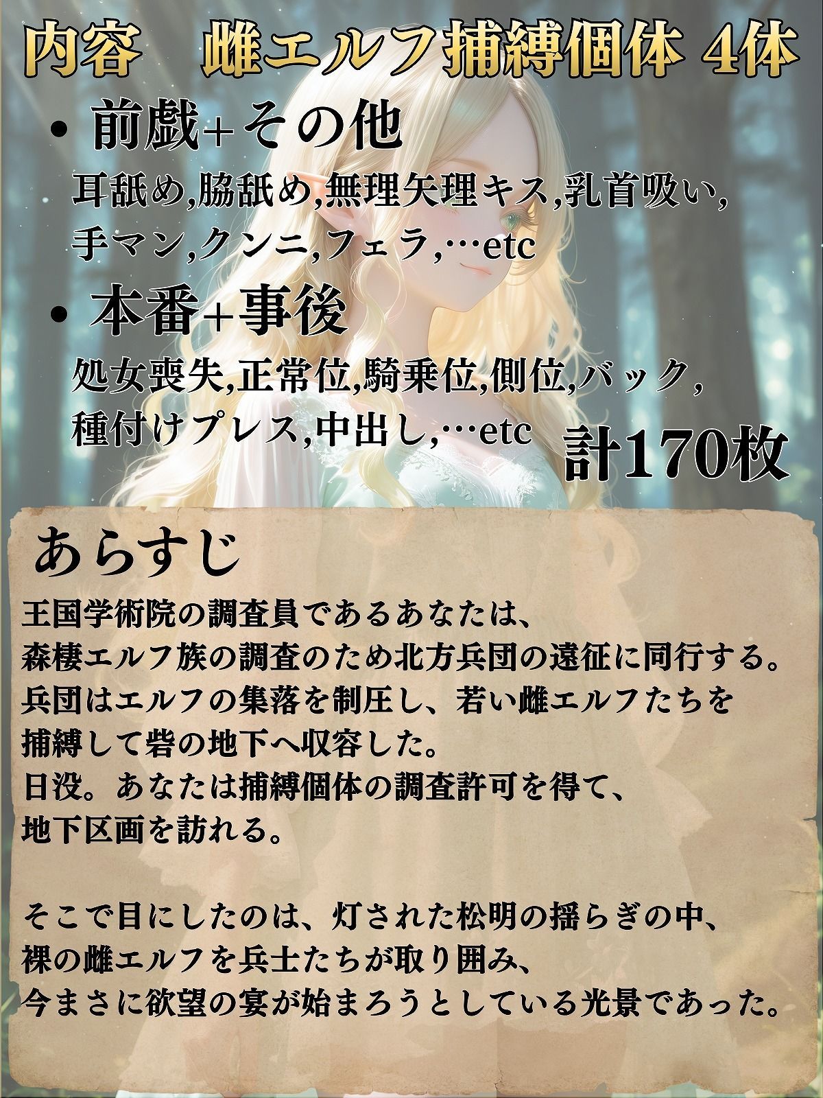 | ジャンル | 処女 スレンダー 乱交 中出し 拷問 戦場 エルフ・妖精 乳首・乳輪 着衣 男性向け 成人向け 魔法 |