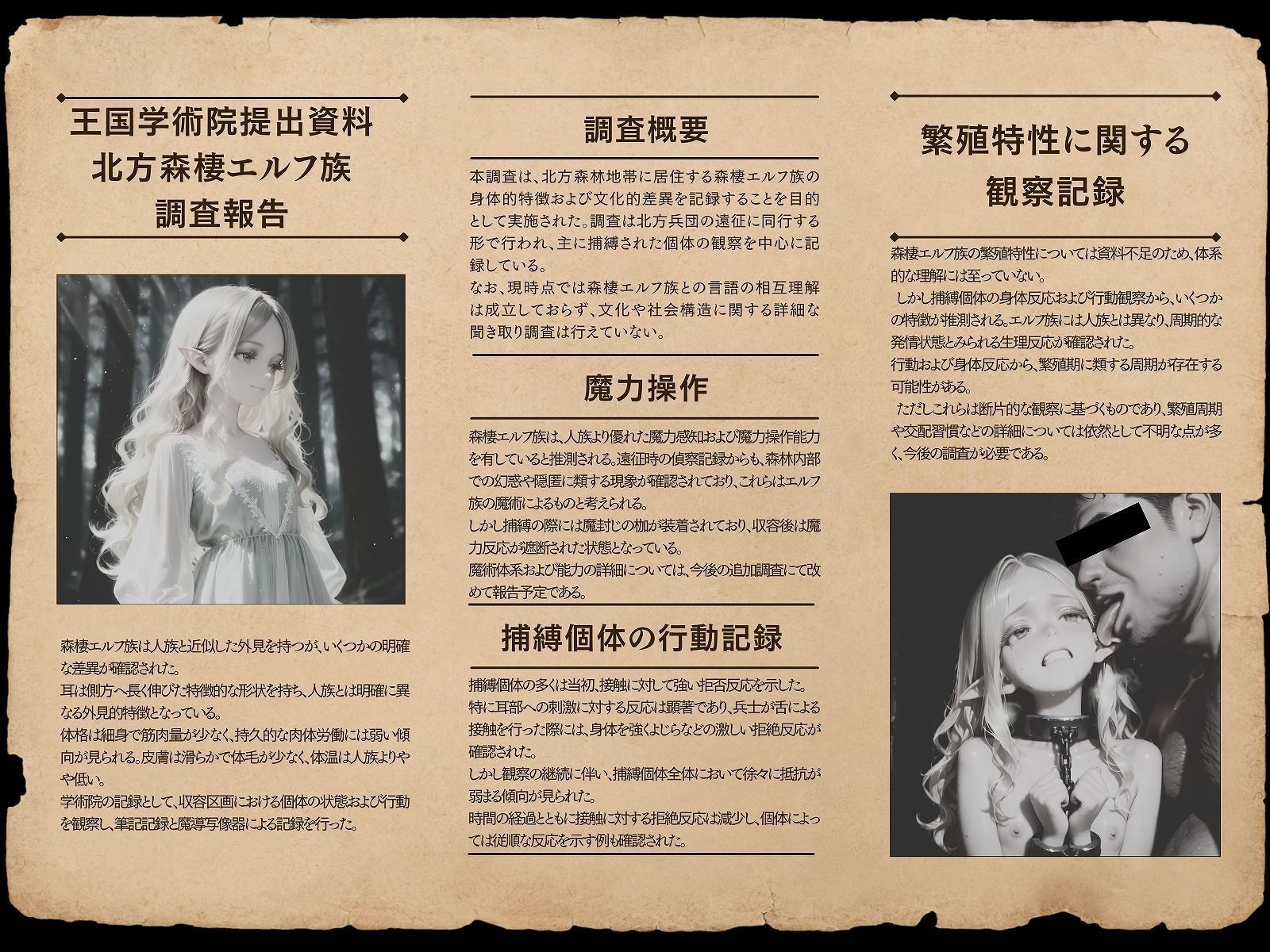 | タイトル | 王国学術院提出資料:捕縛エルフ観察記録 |